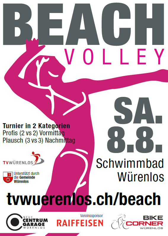 Am 8. August 2020 findet unser alljährliches Beachturnier im Schwimmbad Würenlos statt. Wie bereits im letzten Jahr findet die Profikategorie am Morgen und die Plausch am Nachmittag statt. Alle weiteren Infos findest du auf dieser Seite.